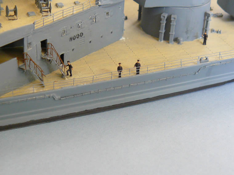 The quarter deck, with some of the minute crew in evidence. The ladder to the left leads to the Admiral's quarters. The circular structure is the barbette of "X" Turret. The twin cable attached to the hull is the degaussing coil which provided protection against magnetic mines.