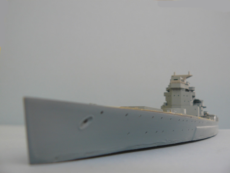 A coat of grey primer is a very good way to highlight imperfections in filling. Several rounds of filling, filing and smoothing will be needed before the cut down hull is finished.