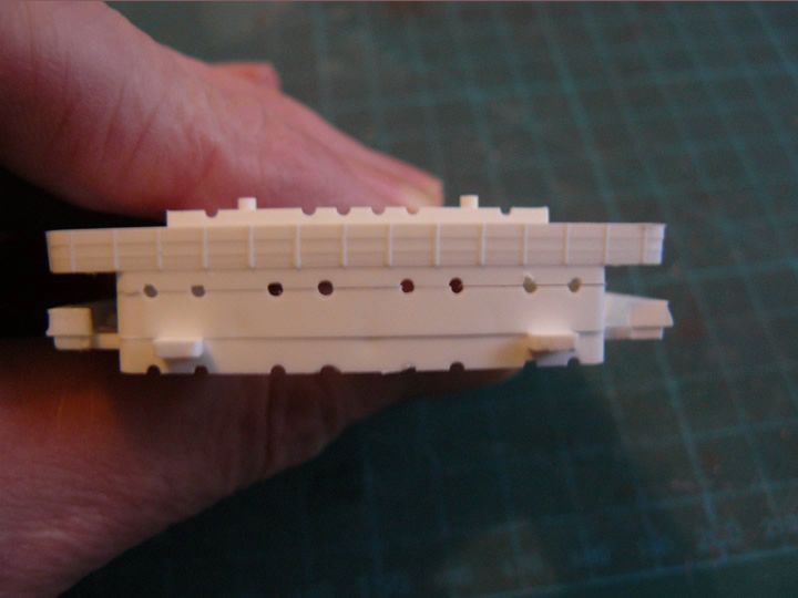 The second problem is the prominent join line between the sections of the upper works - a couple of them are shown held together in the picture to illustrate the issue. The front of the superstructure would be fairly easy to fill, but the sides need to have the support posts for the deck above fitted, which would make subsequent filling of the joint line impossibly difficult. Note here not only the joint line, but a very bad mismatch between the two halves of the mould for the lower section has resulted in that prominent recess at the bottom, which will also require smoothing out. The picture highlights that awful guard rail!