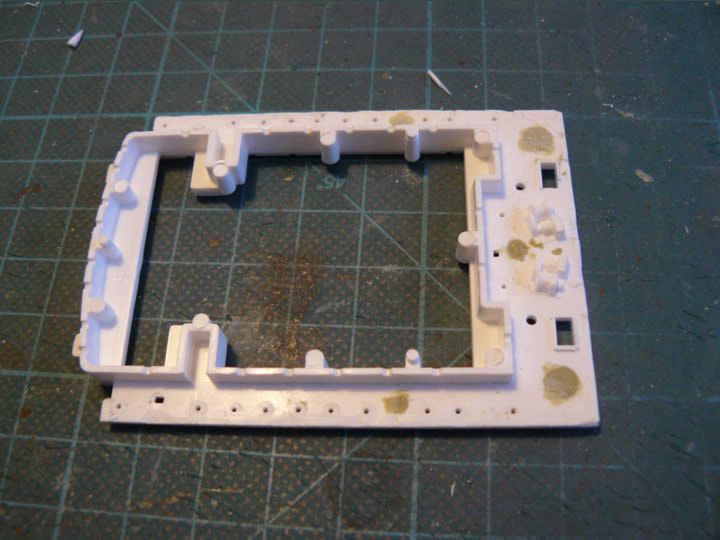 The various deck pieces have very prominent circular indentations, obviously not part of the ship but, presumably, something on the patterns, which are nearly 60 years old. They would be quite noticeable, so before proceeding further these were filled with two part epoxy filler (Milliput) as can be seen in the example shown here.